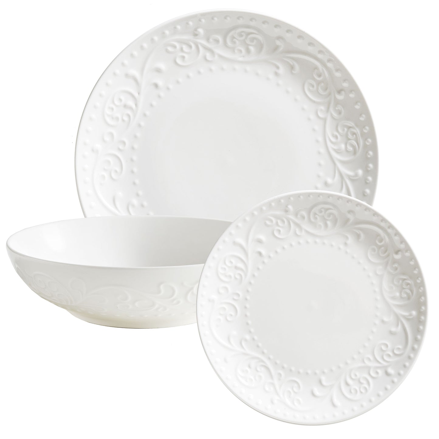 Confezione di 18 piatti da tavola in pregiata porcellana Bone China bianca lavorata composto da: